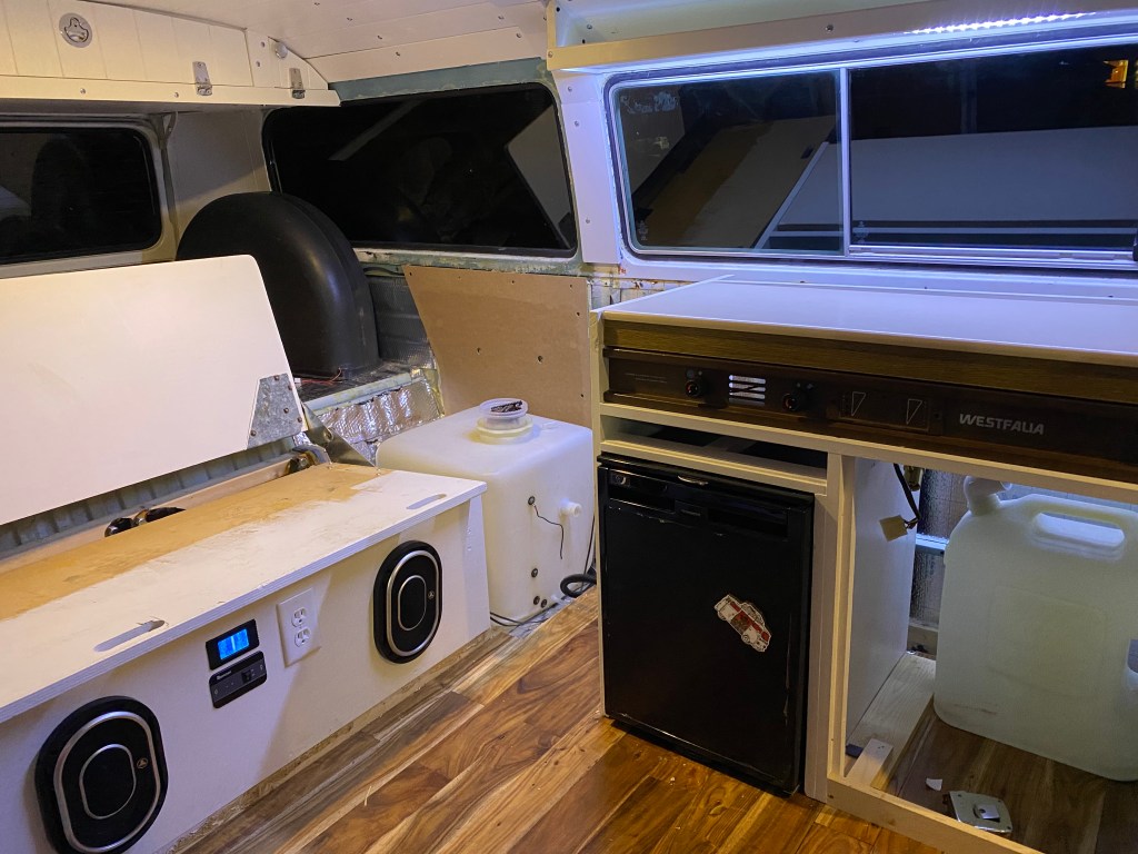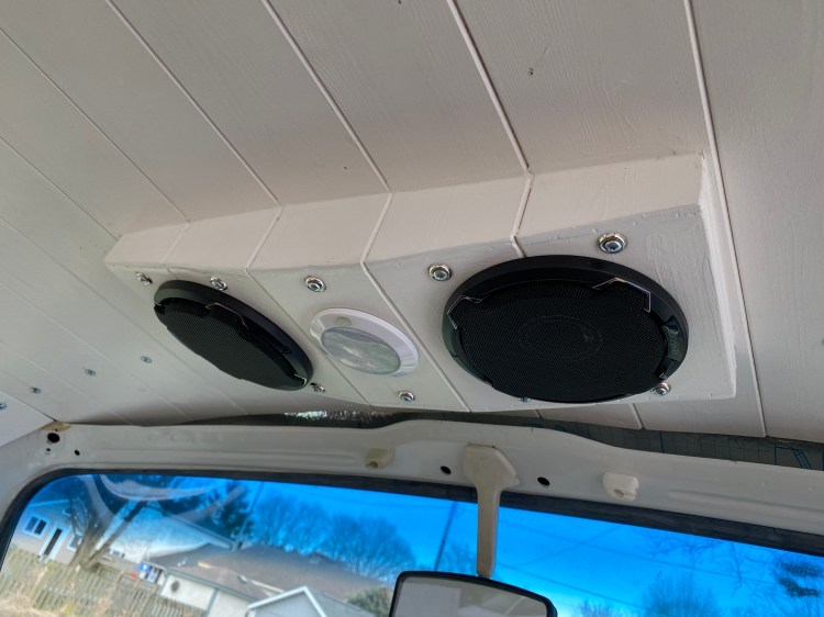 Why didn’t I go with kickers in the door? Because, in my experience, they get kicked. And VW doors are lightweight (and with new German door seals, they require a good slam to shut). I chased the wires up the windshield frame with one set diverting to the center of the front cabin and a set running to the back, then down to the floor, under the water tank and into the bench seat compartment.