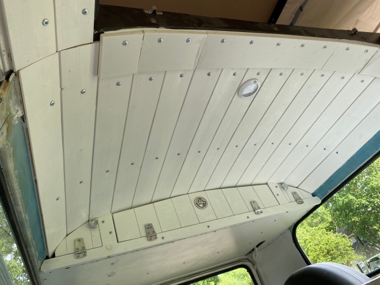 Maybe because Adie is a sleeper bus, maybe because I once visited the Sistine Chapel—beats me—but I love a nice ceiling. I’ve seen the muraled types and the bare metal, traditional headliners (like what I have in the pop top) as well as bamboo. But for Adie, I chose a tongue-in-groove board painted white. Simple, elegant, and surprisingly easy to install.