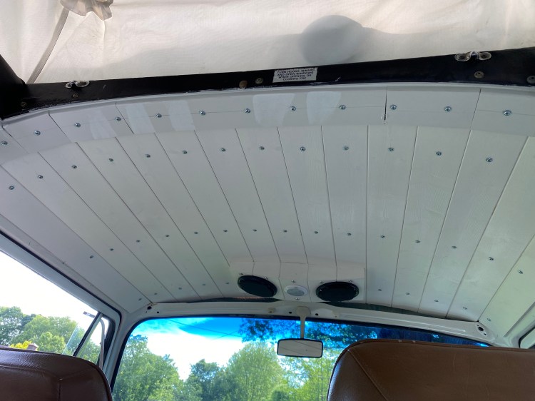 I removed the old ceiling (some mdf boards) and found the wooden ribs in the ceiling. I wanted to continue the chrome rivet look of my upholstered door panels, so I selected a screw that matched. One box of Hakwood gave me just enough to do the entire ceiling (plus the groovy little stereo bezel I have in the front ceiling). Hakwood makes a quality product—not a single warped piece in the box. The wood is smooth and ready to take paint, so no sanding required (though if you want less wood grain, you’ll want to sand lightly as these planks are quite thin).