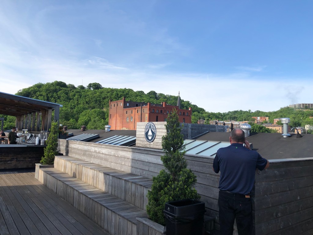 When in Cincinnati one must visit Rhinegeist. If you’re not familiar with the Nasty Nati, you may not know that at one point in time, Over the Rhine (OTR to us locals), was considered a bad part of town. It has since been renovated, updated, gentrified, rehabbed, what have you. At any rate, it is a very cool place to visit (a killer farmer’s market, great breakfast places, wicked cool boutique hotels, a thriving arts scene, good public transit. You get the picture.) In the heart of OTR is a craft brewer, Rhinegeist. They own an old factory building with a great hall containing not one, but two (count them—two!) bars. Plus, there is a rooftop bar that is well worth visiting if for no other reason than taking in the splendid vistas of the Queen City.