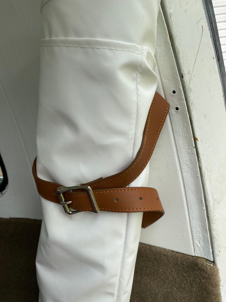 Luckily, the nearby town of Xenia is home to a grade-A leather shop. I mean, this place is the best. The guys who work there are friendly, knowledgeable and stand by their work. Xenia Shoe and Leather is locally renowned for a reason; they are simply fabulous. So, at any rate, I stop in and ask if they can hook me up with some straps. While I was at it, I asked if they could make a cinch strap for the space just inside my back door. I had a decent size screw hole and figured I could mount a strap to hold a cargo bag.