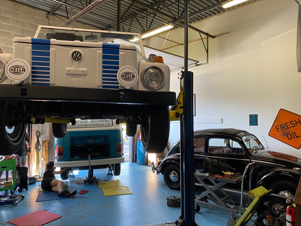 The collection of cars in her shop is a testament to her VW knowledge—the most beautiful Thing I have ever seen, a near-flawless Karmann Ghia, a bug, and, best of all, her bus, Piper, was there. Tracy knows these vehicles cold, yet she doesn’t pretend to know all the answers up front. She wants to investigate; get a good knowledge of the vehicle—what many VW owners call their car’s personality.