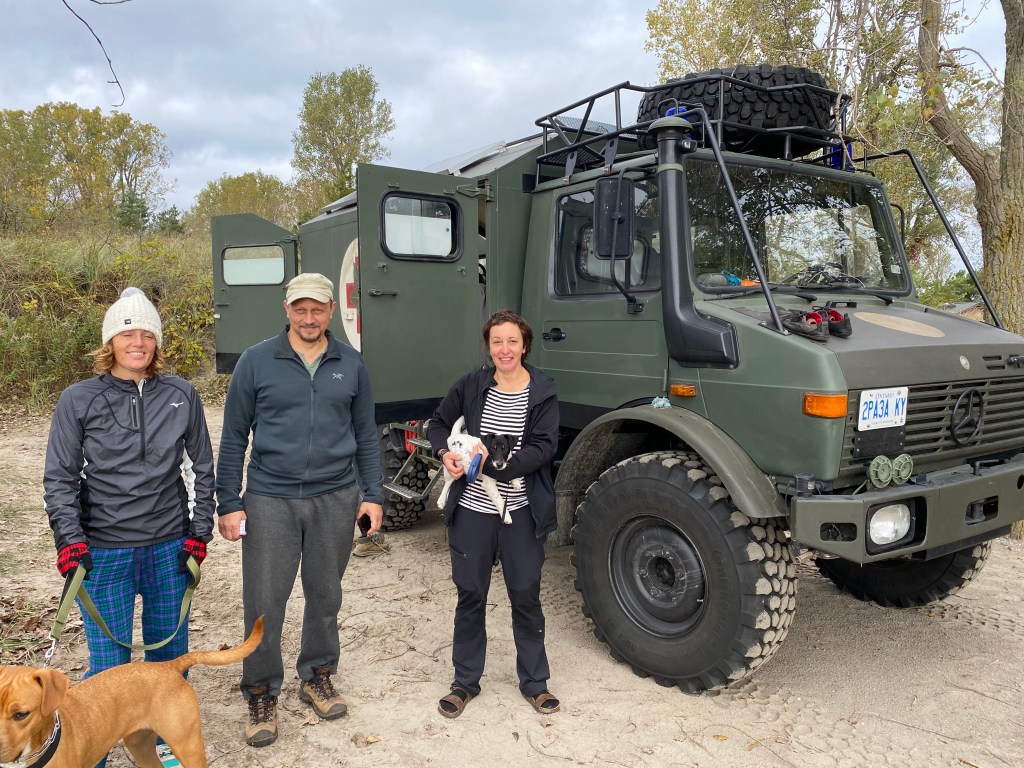 We were staying in Long Point—the last stop before crossing back into America. The night was especially windy and the campground was located on a thin peninsula where escaping from the elements would have been impossible. Miracle and I hunkered down in Adie while she swayed in the breeze and the canvas rumpled and whooshed. Then, cutting through the darkness, we heard a rumble. Low and guttural, this grumbling grew louder until we realized it was some sort of vehicle. I looked out the window and only saw the cabin light of this truck go past. And the cabin light was wayyy up in the air.