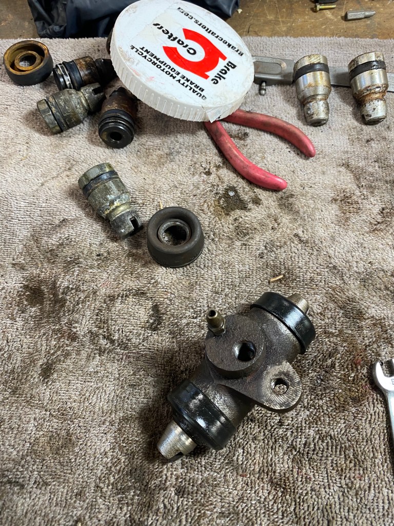 Not only did the drums not show up at Napa, but the cylinders promptly proved to be absolute shit. We put them in place and on the first pump of the brake these cylinders squirted more fluid out than if shot pressurized liquid into a colander. Bob, ever patient and good-natured, took out each cylinder and inspected them. “These really are shit,” he said matter-of-factly. Indeed; once we took the plungers out of the cylinders we found that they had no seat washers, no contour that might stop liquid from passing between the parts and do literally the only thing they are designed to do. It’s as if these Napa parts were manufactured on Opposite Day.