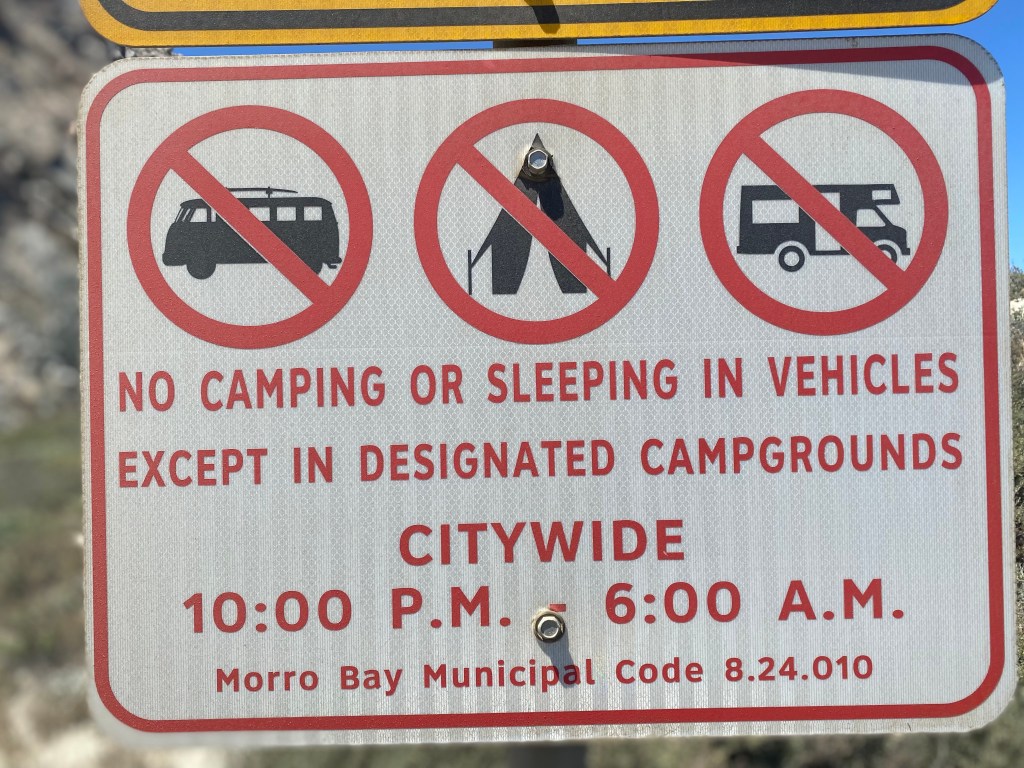 The bus. You’ll see the picture at the top of the blog page and it’s a common one around Morro Bay. For one reason or another, the bus is the symbol they use to show that camping is not allowed. We laughed about this later when we did a Harvest Host near Sacramento. The winemaker said, yeah, buses are trouble because of homelessness and drugs and hippie culture. But we shouldn’t feel bad because a lot of RV parks don’t accept any vehicles older than 10 years. As I said earlier, Miracle and I have been at this living in the bus thing for almost nine months now and have logged enough miles to make it around the Earth one time, but have not experienced this sort of abrasiveness from any other state. It is uniquely Californian. So if you are planning to drive your bus, van, or older-than-a-decade RV through California, here are some tips: