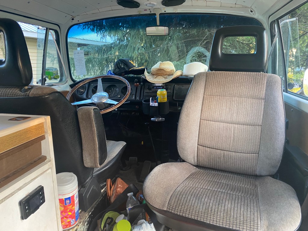 Ken Mitchell, one of our Season Three interviewees shared a key piece of advice with us: Vanagon and Bay seats are interchangeable. The tracks are standard. As it so happened, Tim had a Vanagon on his property he was trying to sell. The only two seats in the entire van were the captain seats. So we traded. The Vanagon now has a touch of Bay Window charm and we had some more comfortable seats to buffer our bones as we rattled down the road. Thank you, Tim!