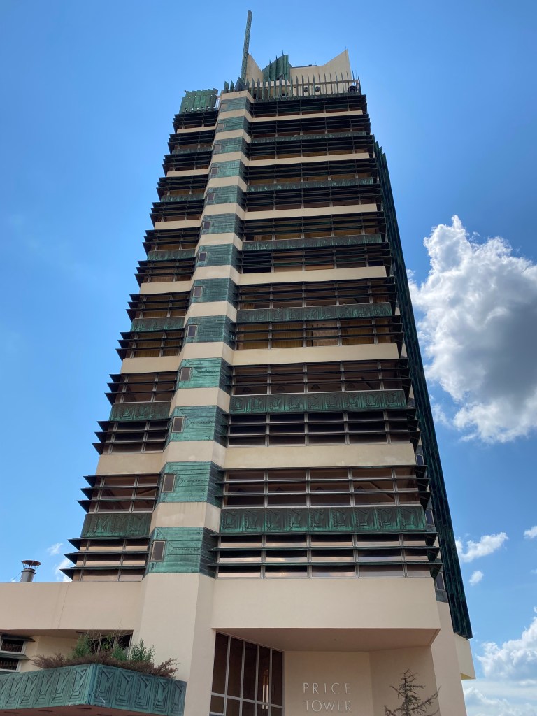 After taking in the only Frank Lloyd Wright skyscraper and the last of the tall prairie, we turned west to Arkansas, hoping for cooler weather, fewer oil leaks, and the climb northward, back toward home (with a few planned detours).