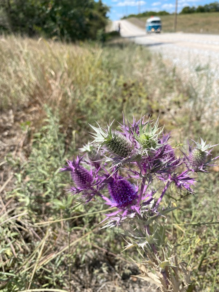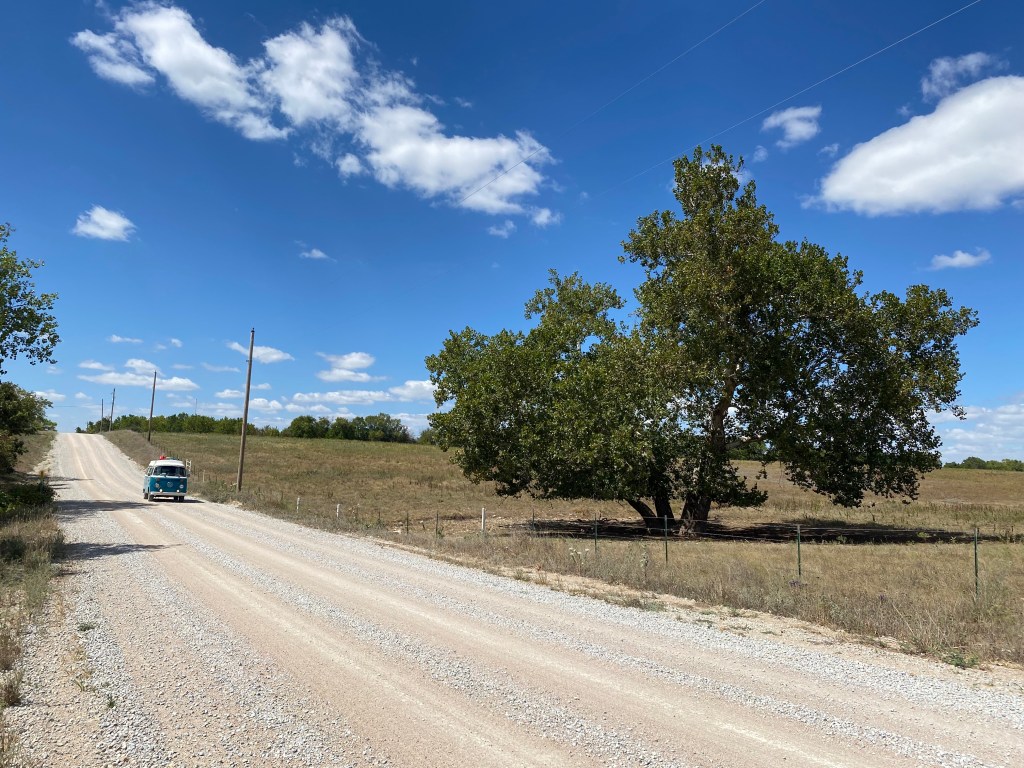 As we met folks along this journey who had lived in or frequented Kansas, we would ask what we needed to see or do when we passed through. Time and time again, we heard, “nothing!” or “drive quickly.” But doing nothing is not our thing and VWs—especially one who only a day ago was bleeding from the gut like a Western duelist after a last heroic gun battle—do not go quickly into any good night. We had a destination—a driveway stay with a gentleman named Pat who contacted us on Facebook. He said he had a cool spot to park by a pond and showers. In a follow-up email he said we could come in for dinner and that his area, the Flint Hills, were worth seeing.