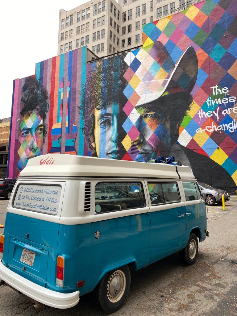 We came back to Minnesota to pick up the bus at Dune Buggy Supply and decided to swing by the Bob Dylan mural in downtown Minneapolis. When our friends at Happy Productions, Shawn and Emma, found out we would be in the neighborhood (a couple of hours qualifies as being in the neighborhood in the northerly reaches of the US), we decided to meet up for lunch. Being VW people, nothing went as planned. We interviewed Sam for our podcast when we picked up Adie and that went long. (You can catch his podcast in Season 4 or 5.) Getting to the mural involved a lot of maneuvering in order to avoid the $12 parking fee. Lunch became dinner.
